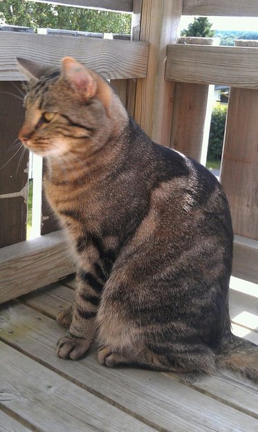 Zico er en stor katt, med spraglete pels. Svarte striper bakover langs ryggen. Grønt merke i venstre øre.