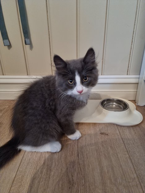 Pusen er ca 7 måneder. Den er mørkegrå med hvite poter og snute.