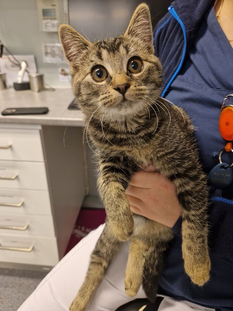 Ung og sprek katt. Vil anta at alder er mellom 10-15 uker. Hun er ikke chippet.