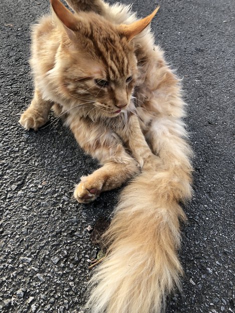 Flott kontaktsøkende stor katt Halsbånd med bjelle Kan ikke finne navn eller telefonnummer på halsbånd. Orange farge Mulig en Maine Coon katt
