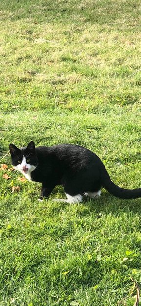 Svart og hvit, ukastrert hannkatt. Ikke chippet. Hvite bakbein, hvite poter foran. Halen er helt svart. Hvit under magen og oppover hals og i ansiktet. Kosete, tam og tillitsfull.