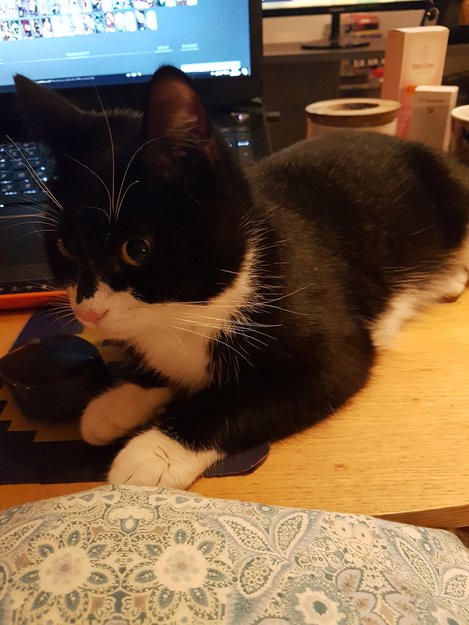 Ser ut som han har svart Batman maske på. Hvit under på magen og potene.