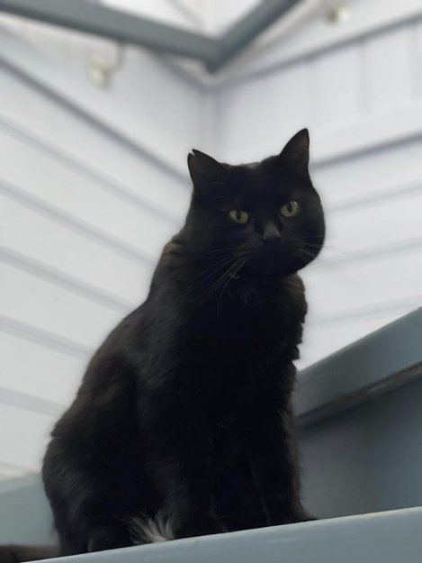 Cat er en liten svart hunnkatt, med noe hvitt på brystet og buken. Hun har en rift i høyre øre og hadde på reflekshalsbånd da hun gikk ut. Hun er chippet.