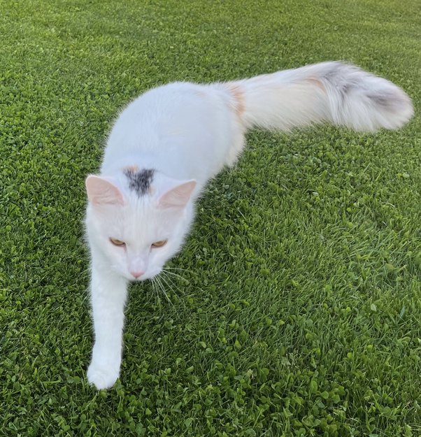 Nesten helt hvit, men sort og lysebrun på toppen av hodet og halen.