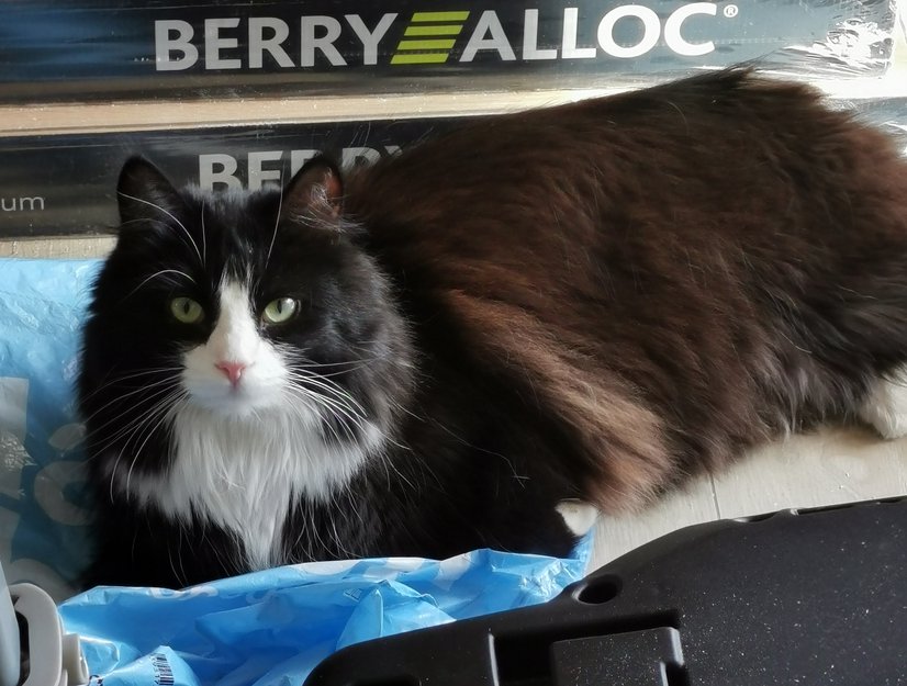 Hovedsakelig svart pels, men hvit på bryst, mage og poter. Veldig fluffy hale.
