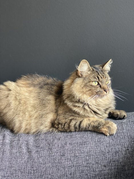 Hun er en ganske stor tabby farget pus, og lyder navnet sitt Belle. Hun er utrolig kjælen, men sky i starten. Elsker kos. Stor manke, lang/mye pels. Sikler når hun får kos. En gul pote foran.