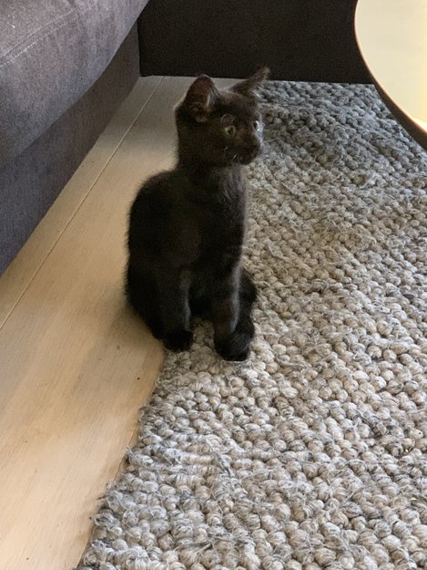 Mini er bare rundt 4 måneder gammel og innekatt enda, selvsagt. Må ha klart å hoppe ut et åpent vindu i går. Er 100% svart, til og med værhårene og potene er svarte. Orangebrune øyne.