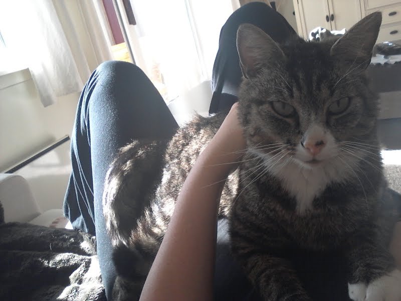Hvit på bryst og ved nese. En liten svart prikk på nesa er et markant kjennetegn. Grå tigerstripet ellers. Utrolig kosete og glad i folk og skikkelig matvrak. Liker også å snakke