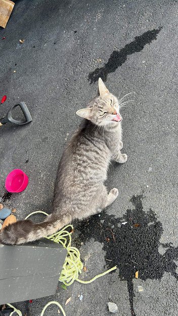 Denne katten har gått rundt i nabolaget i 3 uker. Veldig tynn, og har brukket begge hjørnetennene. Får mat og bor i en eske i garasjen. Har ikke chip. Trenger ett hjem.