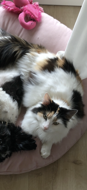 Til vanlig meget kjælen og kontaktsøkende katt. Hvit med brune og svarte tegninger.