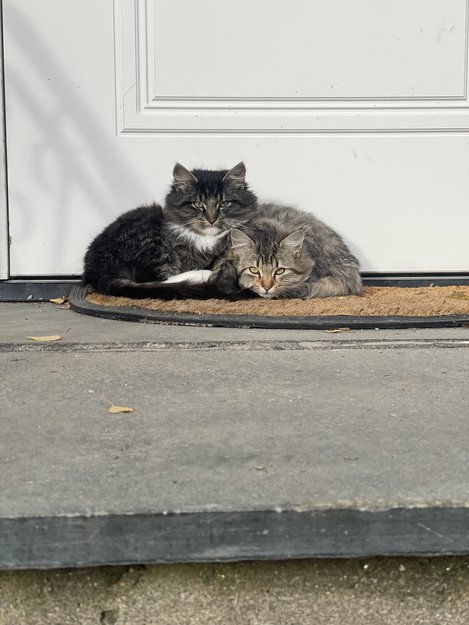 To ungkatter har sovet foran inngangsdøra mi siden Igår kveld, veldig søte, men redde. De er tydelig søsken, og tipper de hvertfall er under året. De holder seg på trappa, og mjauer fordi de vil inn.