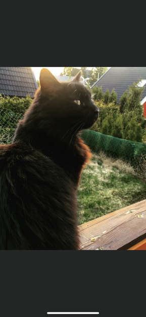 Han er forsiktig, men kommer gjerne bort å stryker seg inntil benet, men ikke glad i å bli holdt.
