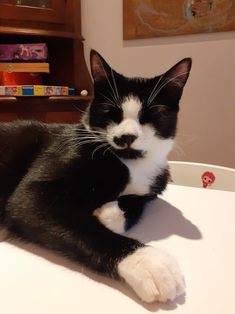Har en karakteristisk sort nese og bart, samt sort hake. Hvite poter.