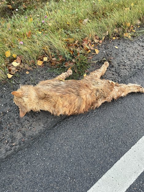 Katt ble påkjørt, død, funnet på morgen, på Føynlandveien, på veien, kl. 09.00. Hann, stor voksen katt, oransje/gul pels. Ble borte på kvelden. Har bilder av pus.