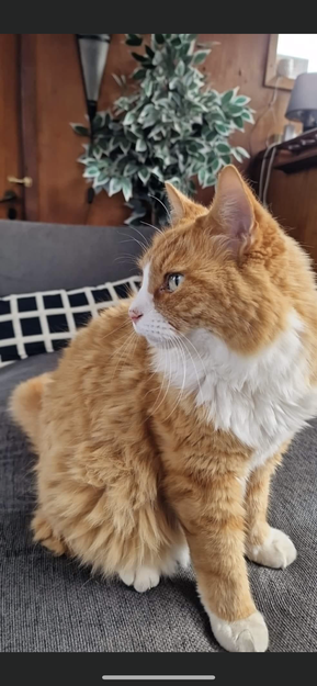 Lang håret, oransj og hvit. Har noen hårknuter på ryggen.