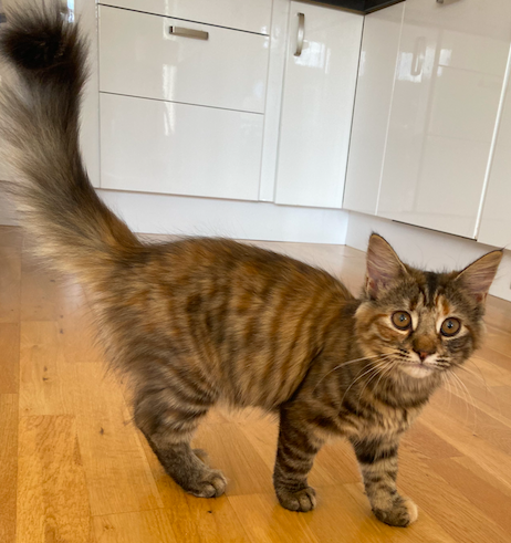 Hun er litt av alt, både stripete og flekkete. Flerfarget, både brun, grå, hvit, svart og oransje farge i pelsen. Hun har en oransje flekk på venstre pote foran. Langhåret på halen. Er chippet med tatovering i høyre øret.