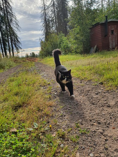 Kastrert svart og hvit hannkatt. Kosete, og pratsom katt. Han kan være sky ovenfor fremmede. Det er ikke så lenge siden han var i slåsskamp, så han kan fremdeles ha litt kort hår midt oppå hodet.