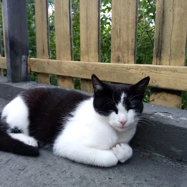 Altså sort og hvit katt, med hvit spiss i panna, ser også ut som om hun har svart eyeliner. Veldig tillitsfull, ikke redd for hunder, bare skeptisk.