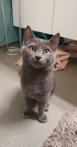 Fullstendig grå med gulgrønne øyne. Ekstremt sosial og vennlig. Vage striper på halen. Kattunge på 4-5 mnd
