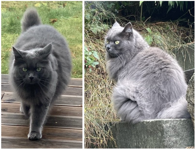 Grå katt med mye pels. God og litt lubben. Redd biler og sykler, men ellers kosete og søker kontakt.