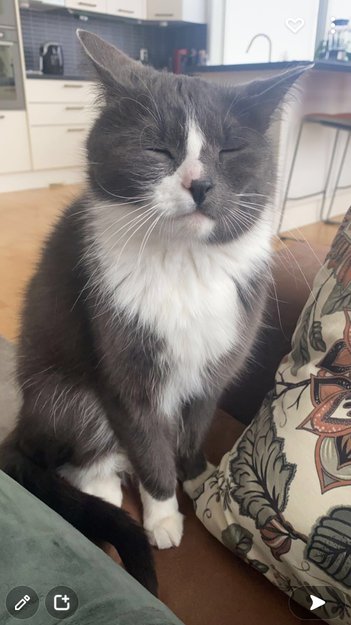 Hovedsakelig mørkegrå hunnkatt med kvitt på magen, potene og deler av ansiktet.