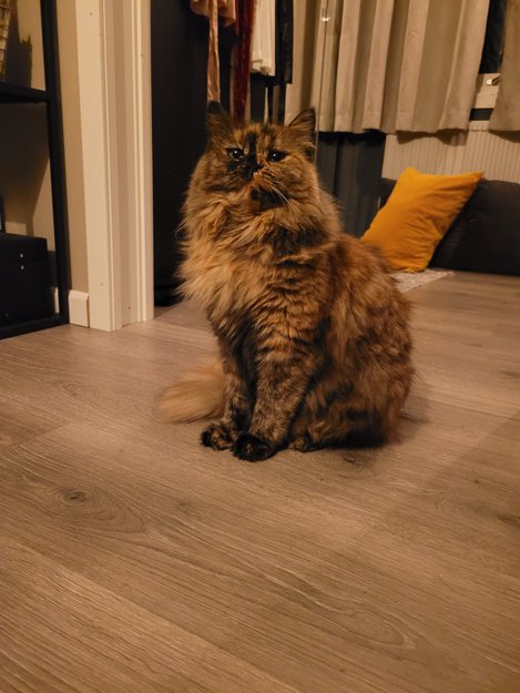 Lava er 3,5 år og er en omplasseringskatt via FOD-gården, hun ble funnet ute med 2 små kattunger sommeren 2021. Og jeg adopterte hun november 2021, så hun har bodd hos meg i 1 år. Hun er chippet og sterilisert. Hun er litt skvetten av seg, men nyskjerrig og veldig kosete når hun først blir "varm i trøya" , fortsatt ganske leken til å være voksen. Hun var inne det første halve året, før hun begynte å lufte seg litt på terrassen og det lille skogholtet vi har rett utenfor, men hun kom alltid inn igjen enten på kvelden eller morgenen etter. Nå har hun vært borte siden 6.11.