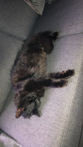 Han har sort pels med litt grått på magen og han har også en krølle bak hvert øre