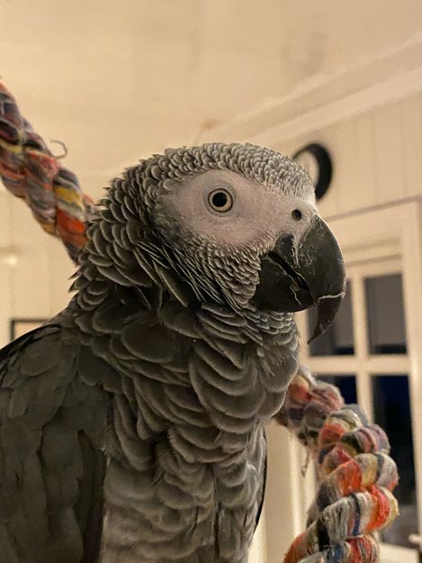 Papegøyen flyr ofte fritt inne, og plutselig fløy han ut ved et uhell da vi gikk ut døra.