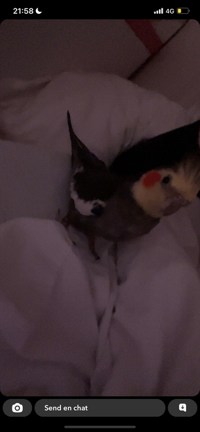 Han har begynt p få mørkere farge på det grå, blitt litt hvitt på hode og noe gult på brystet nå. Utrolig tam og kjærlig. Elsker kos, elsker å spise fra munnen din og setter seg lett på hode.