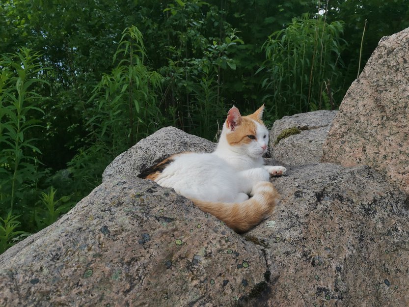 Liten og korthåret katt, hovedsakelig hvit med oransje hale, hode og rygg, og små svarte flekker på ryggen og haletipp. Har en rift i høyre øre.