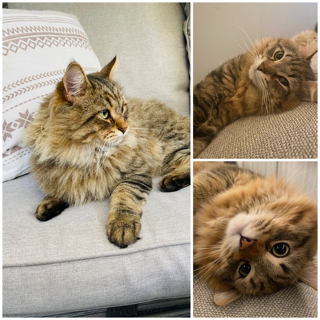 Brun sibirkatt, hvit haletupp og hvit rundt munnen.