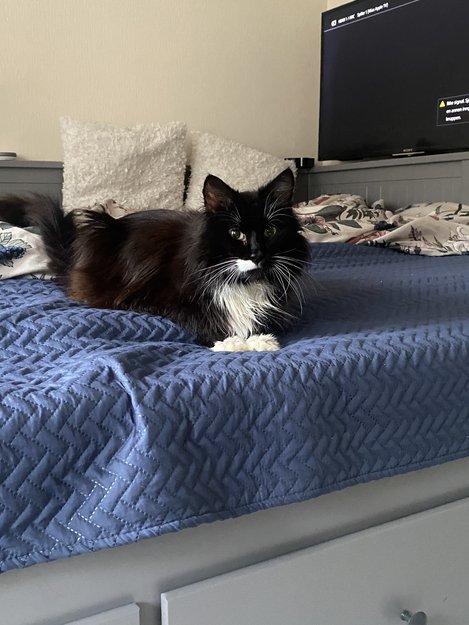 Han er mest svart, men hvit på brystet han har hvit pels på føttene så ser ut som han har på seg sokker. Også er han hvit på den ene siden av munnen. og har fine gul/grønne øyne