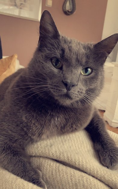 Hun er helt grå og har en liten hvit flekk på brystet.