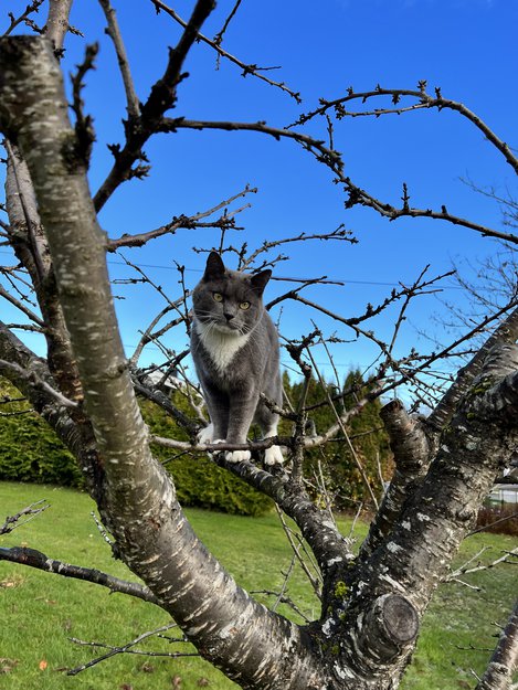 Grå tykk pels med hvitt bryst. Hvit rundt leppen og på poter. Veldig vennlig og kontaktsøkende katt. Lyder navnet sitt og er veldig kosete. Han kan mjaue høyt.