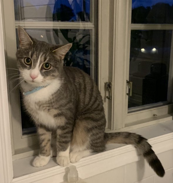 Han er omplassert fra Nøtterøy og har vært inne i 4 uker. Har vært ute i hagen i 4 dager før han forsvant, så han er litt kjent rundt huset, men ikke i området rundt.