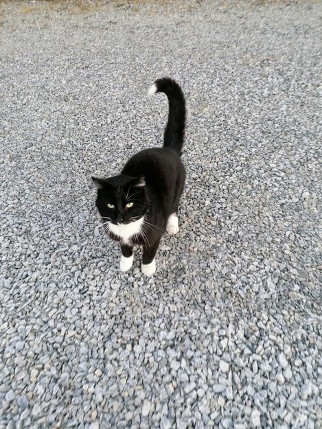 Svart katt, med hvit tupp på hale, hvite poter og hvit hake/brystparti.