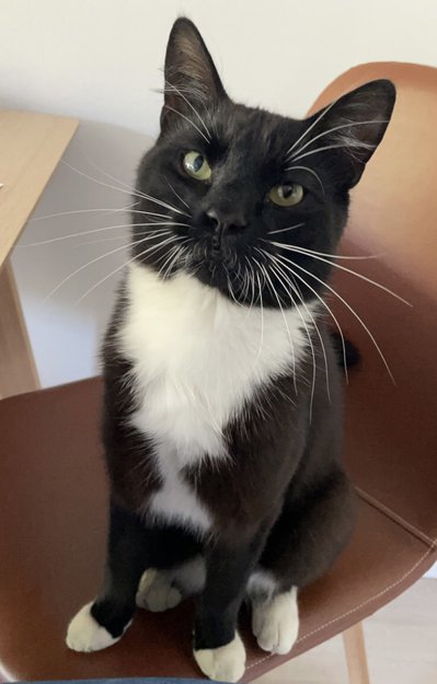 Han er en svart katt med hvitt bryst/mage, hvite værhår og hvite sokker. Han mangler en hjørnetann.
