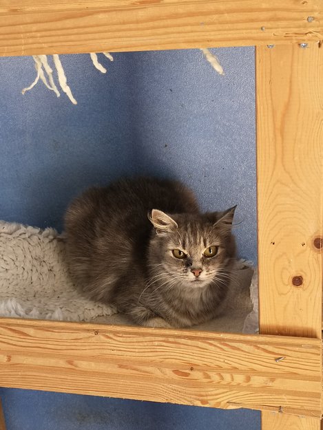 Hun er en nokså liten katt, ensfarga grå og litt langhåra.