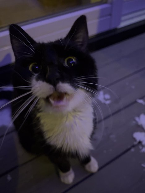 Fant denne katten i katten vår sitt tilholdssted ute. Den var radmager og klarte knapt bevege seg da den haltet og hadde skadet halen. Virket svært tam og kontaktsøkende - men var i desperat matmangel og smerter.