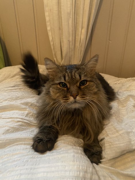 Den er full av store klumper med hår og et tjukt lag nærmest huden, det virker ubehagelig. Den har også mistet et stort område av den tjukke pelsen sin, antakelig fordi laget med hard pels falt av. Katten hoppet opp på lårene mine for å varme seg, og jeg lot den komme inn i bilen for mer varme. Den var veldig kostete, og presset seg inntil meg.