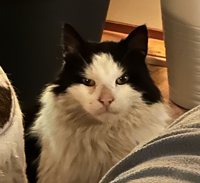 Hunnkatt uten chip. Ganske stor, svart og hvit. Veldig kosete men også forsiktig. Liker ikke høye lyder eller bråe bevegelser. Snill mot andre katter.