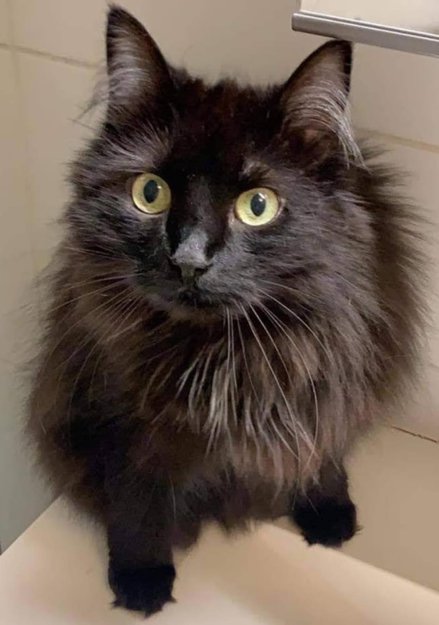 Hun er nesten helsort. En liten flekk hvit på brystet og en bitteliten flekk på nakken. Hun mangler en hjørnetann øverst. Hun er kastrert og har chip.
