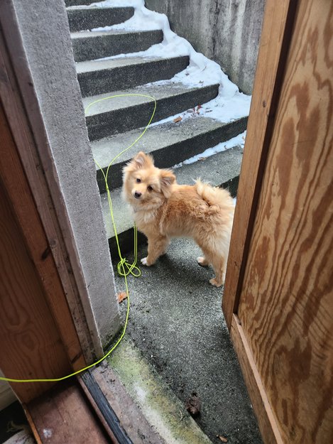 Vår nye valp ble skremt av båsdunken og klarte å rykke til seg bondet sitt, og sprang i retning fra Tjelta langs Tjeltavegen mot Sandnes/Sola langs tjeltavegen / gamle tjeltaveg