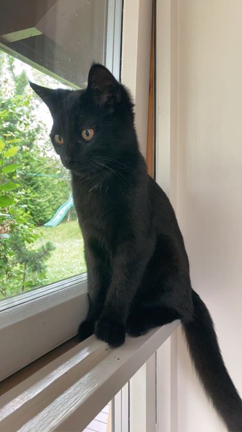 Maya er en svart katt med gule øyne. Hun er 8 måneder gammel, og hadde på et grått halsbånd når hun ble borte, men kan ha greid å fått det av seg.