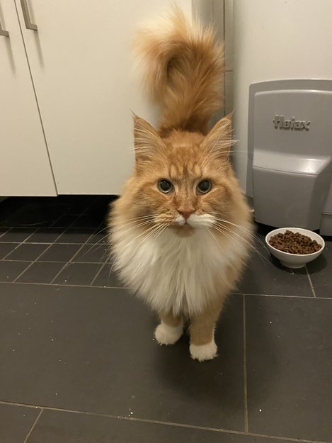 Oransj lang pels, stort hvitt parti på brystet, hvite poter. Hvit flekk på ene kinnet, pus sin venstre side. Legger seg på rygg for å bli klødd, liker å bli bært og kosa med. Prater innimellom:)