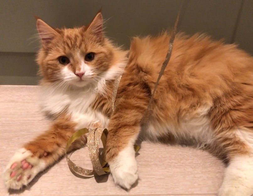 Oransje fluffy pels, hvit på bryst, under magen og nederst på potene.