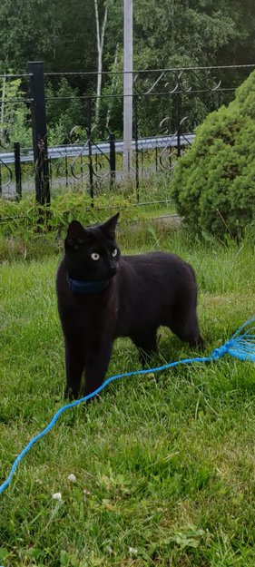 Svart hannkatt med gule øyne, relativt stor, sort halsbånd med hvite poter og navneskilt, tydelig hengemage