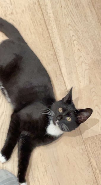 Pus er svart og kvit, og kan lett kjennest igjen på den kvite stripa frå nasa og nedover. Han er ein kastrert og chippa hannkatt.