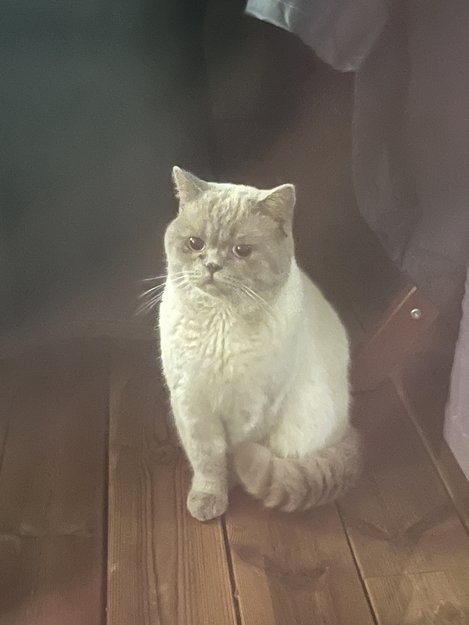 Katt som står utenfor verandadøren og piper. Uten halsbånd. Veldig tam