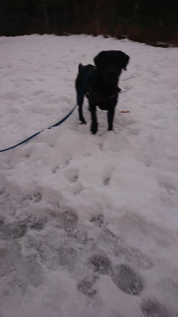 Denne hunden kom til oss i hagen kl 14.30 med blått bånd etter seg